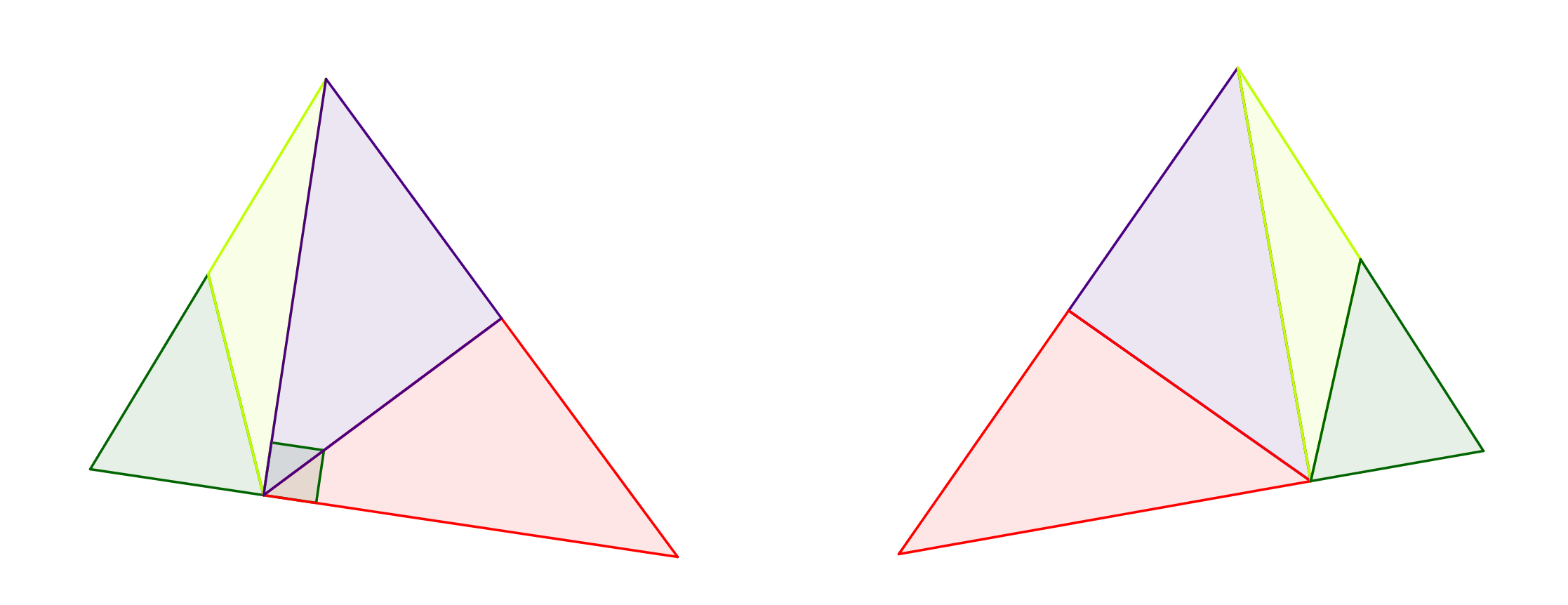 Ici, on a trouvé un découpage du carré A qui permet d'obtenir le rectangle R A par recollement et un découpage du triangle B qui permet d'obtenir le rectangle R B par recollement. Comme A et B ont même aire les rectangles R Aet R B, de largeur 1, ont même longueur, ils sont isométriques. En superposant le découpage rouge et le découpage bleu de R, on obtient un découpage vert de R en morceaux plus nombreux qui permettent d'obtenir par recollement soit A, soit B.