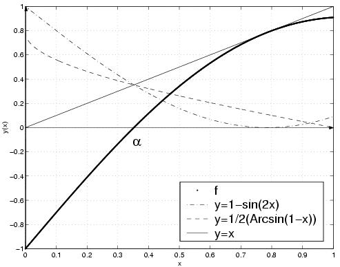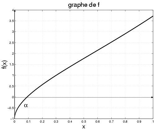 On voit bien que f admet un unique zéro α[0,1] et que les graphes des fonctions