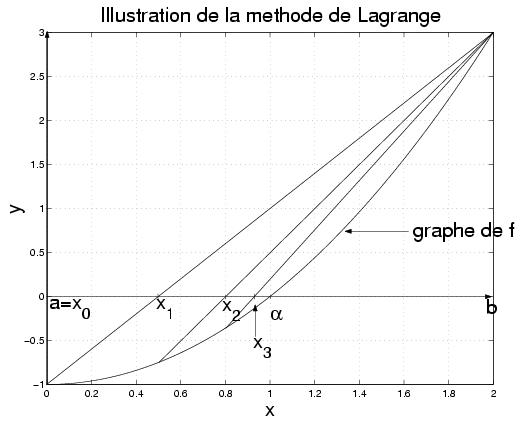 Dans certaines situations, la dérivée de f est très compliquée voir même impossible à calculer. Dans ce cas, nous approchons la dérivée par un taux d'accroissement. Ce que nous obtenons est appelée la méthode de Lagrange ou méthode de la sécante: